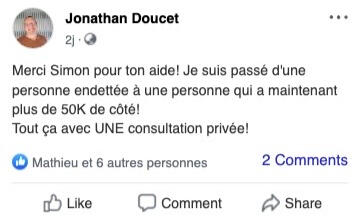 Merci Simon pour tous tes conseils ! Grâce à toi, j’ai enfin pu prendre le contrôle de mes finances et économiser plus de 10 000$ en quelques mois. Ton approche est simple, honnête et m’a vraiment ouvert les yeux. Je ne pensais pas que c’était possible, même pour moi.